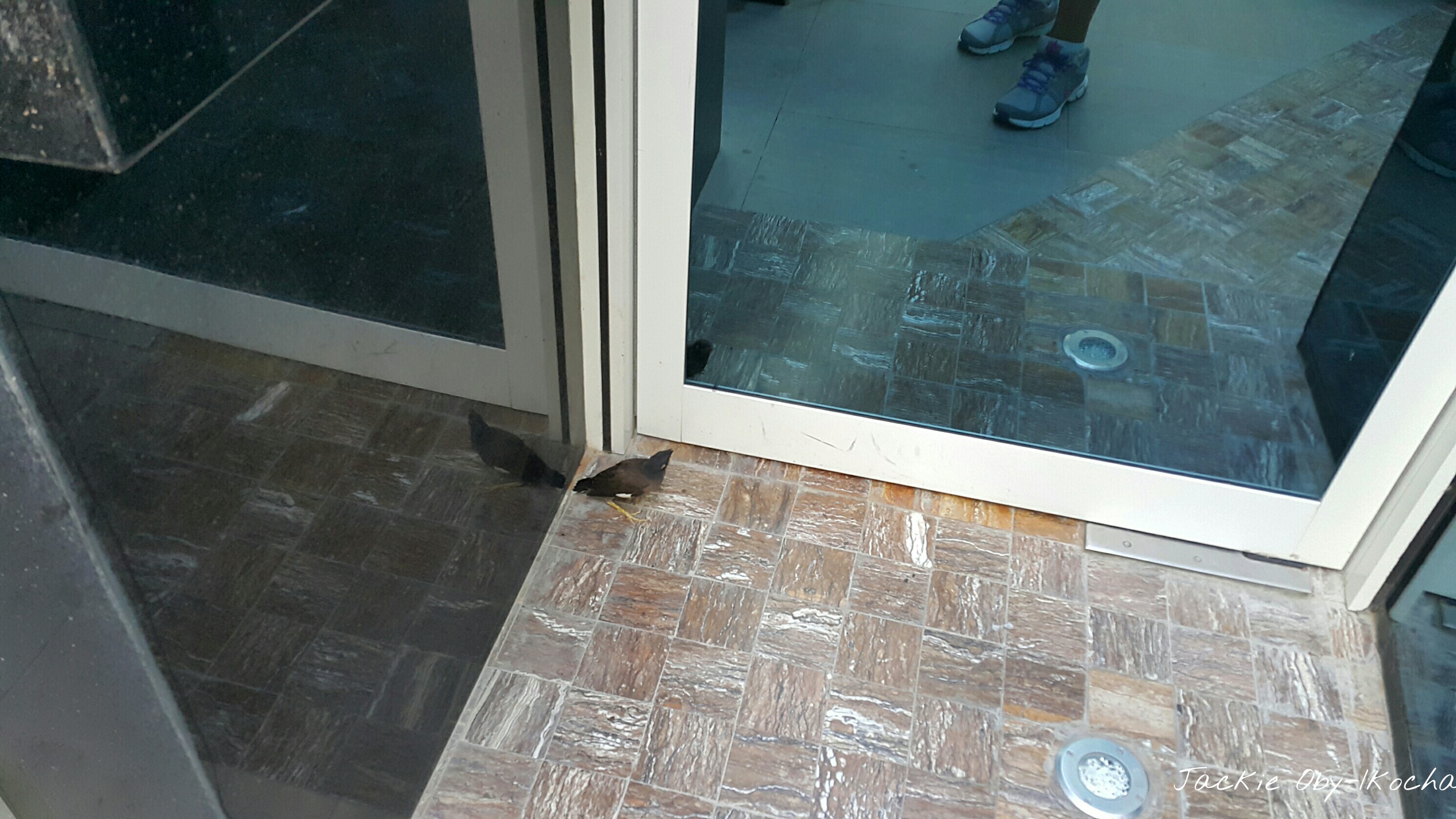 Is it usual to have a little birdie create a road block when you are stepping out for a brisk walk? The mirrored feet in the glass belongs to me 😉